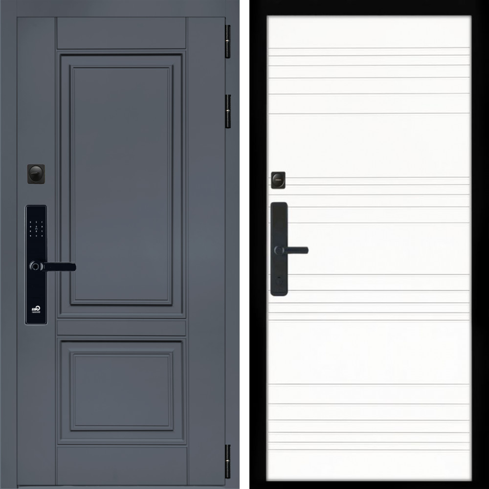 Входная дверь • Габаритные размеры: 2050x860 мм, 2050x960 мм • Металл 1.8мм. Черная шагрень • Внешнее покрытие: МДФ 12 мм. • Толщина полотна: 115 мм. • Толщина коробки: 120 мм. • Короб закрытого типа, утепленный • Уплотнитель: 3 контура • Два вертикальных ребра жесткости • ЭЛЕКТРОННЫЙ ЗАМОК НА ВЫБОР • Замок дополнительный: Гардиан 6001 • Врезная броненакладка • Пазы на коробке под доборы • Независимая задвижка есть • Фурнитура ЧЕРНАЯ