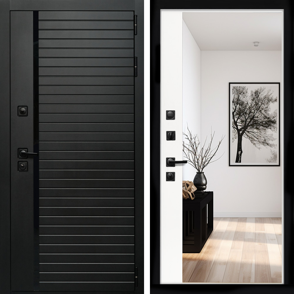 Входная дверь Inteko Агат (Черный кварц,черное стекло) + Зеркало панорама Белый софт