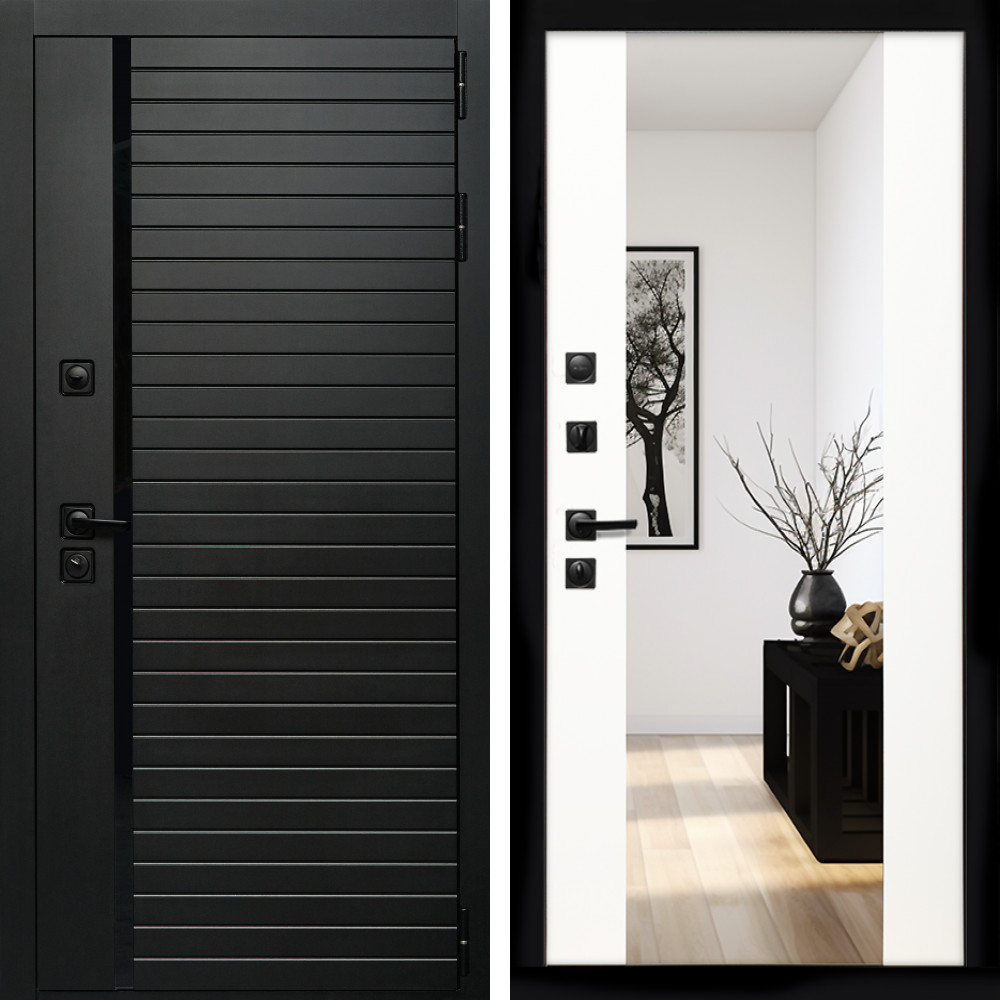 Входная дверь Inteko Агат (Черный кварц,черное стекло) + Зеркало сб-16 белый матовый