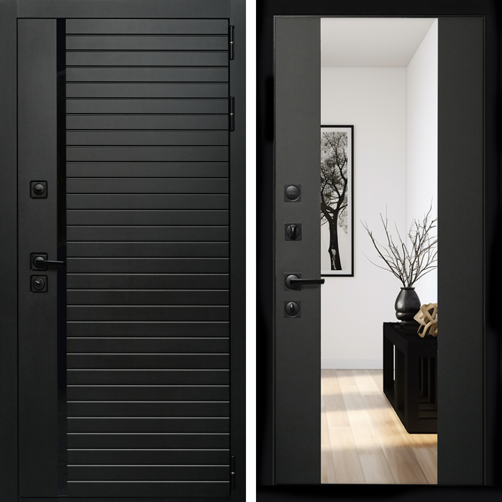 Входная дверь Inteko Агат (Черный кварц,черное стекло) + Зеркало сб-16 черный кварц