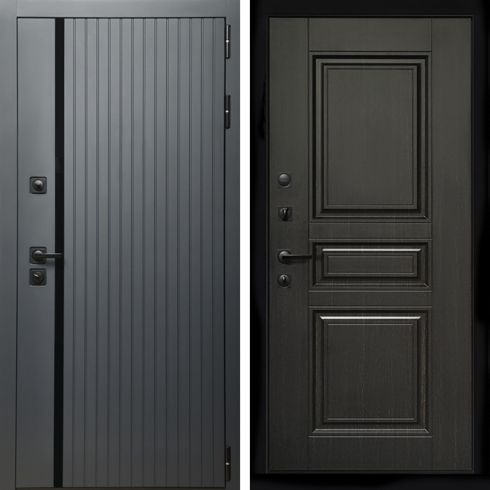 Входная дверь • Габаритные размеры: 2050x860 мм, 2050x960 мм • Металл 1.8мм • Внешнее покрытие: МДФ 16 мм. • Толщина полотна: 115 мм. • Толщина коробки: 120 мм. • Короб закрытого типа, утепленный • Уплотнитель: 3 контура • Два вертикальных ребра жесткости • Замок основной: Гардиан 6211 с блокировкой язычка • Замок дополнительный: Гардиан 6001 • Врезная броненакладка • Пазы на коробке под доборы • Независимая задвижка есть • Фурнитура Черная ..