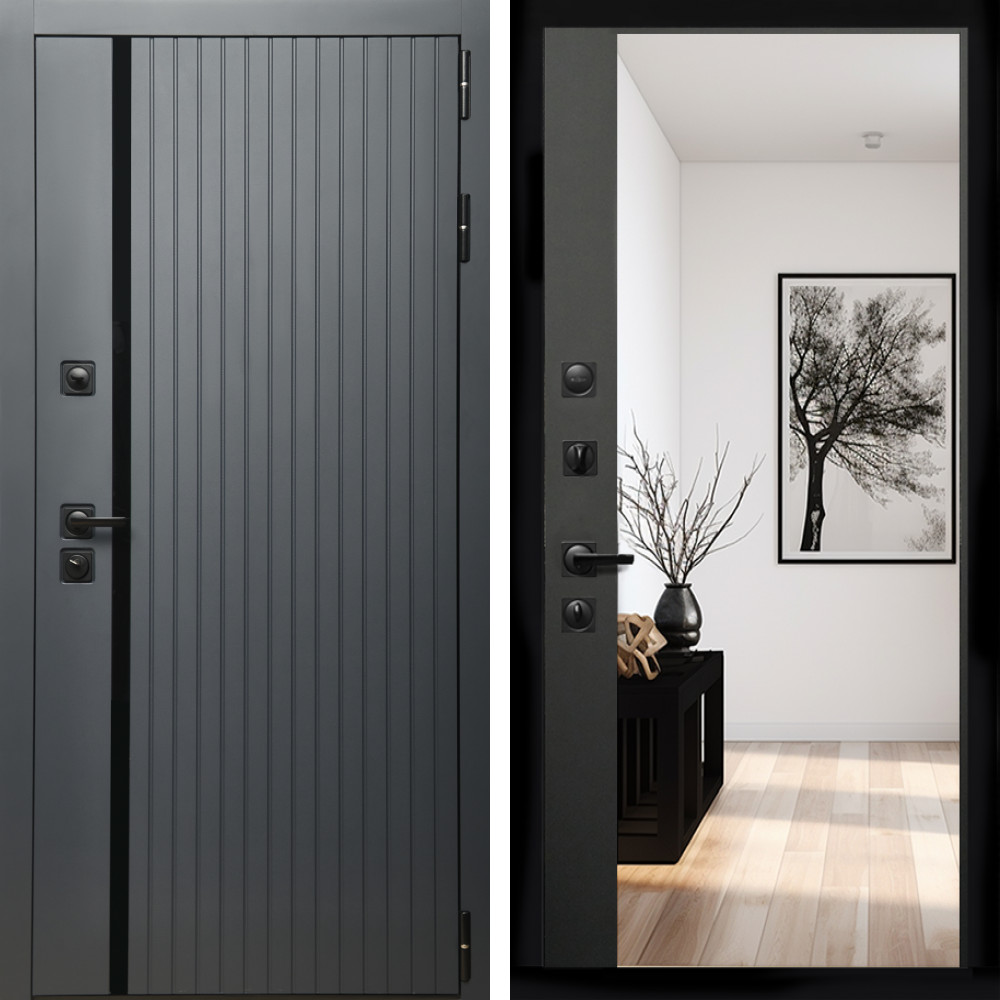 Входная дверь Inteko Агат Графит (Графит, черное стекло) + Зеркало панорама Черный кварц