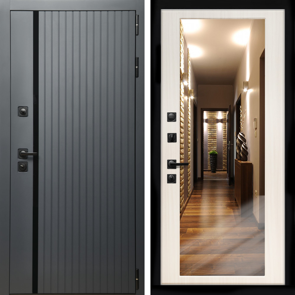 Входная дверь Inteko Агат Графит (Графит, черное стекло) + Зеркало сандал белый
