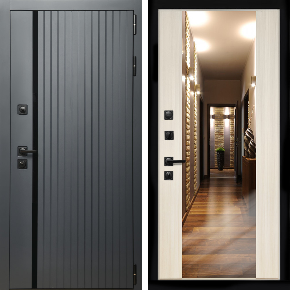 Входная дверь Inteko Агат Графит (Графит, черное стекло) + Зеркало СБ-16 сандал белый
