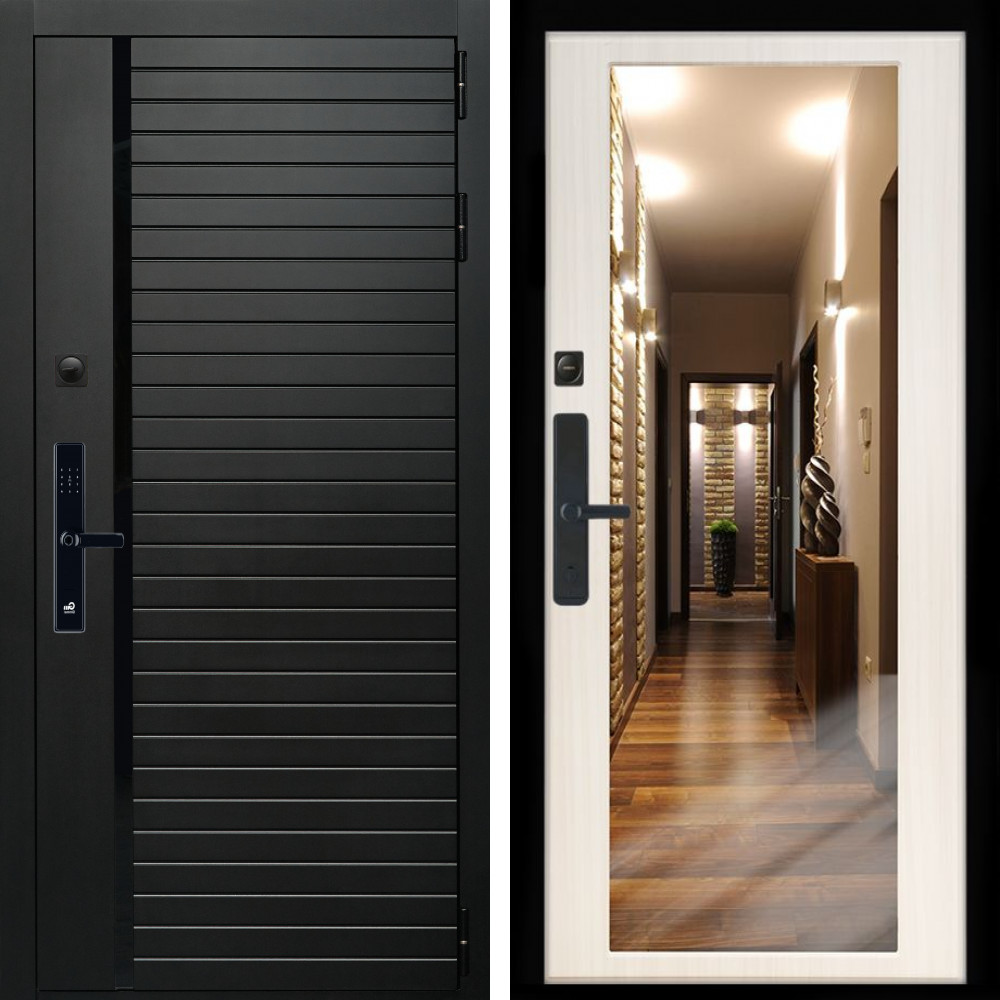 Входная дверь • Габаритные размеры: 2050x860 мм, 2050x960 мм • Металл 1.8мм. Черная шагрень • Внешнее покрытие: МДФ 12 мм. • Толщина полотна: 115 мм. • Толщина коробки: 120 мм. • Короб закрытого типа, утепленный • Уплотнитель: 3 контура • Два вертикальных ребра жесткости • ЭЛЕКТРОННЫЙ ЗАМОК НА ВЫБОР • Замок дополнительный: Гардиан 6001 • Врезная броненакладка • Пазы на коробке под доборы • Независимая задвижка есть • Фурнитура ЧЕРНАЯ ..