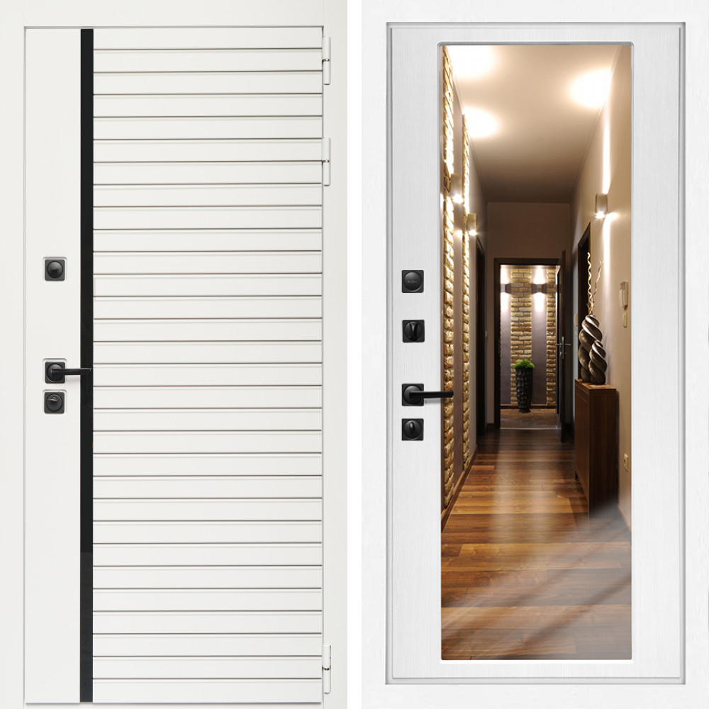 Входная дверь Inteko Агата Вайт (Бел мат, черное стекло) + Зеркало беленый дуб
