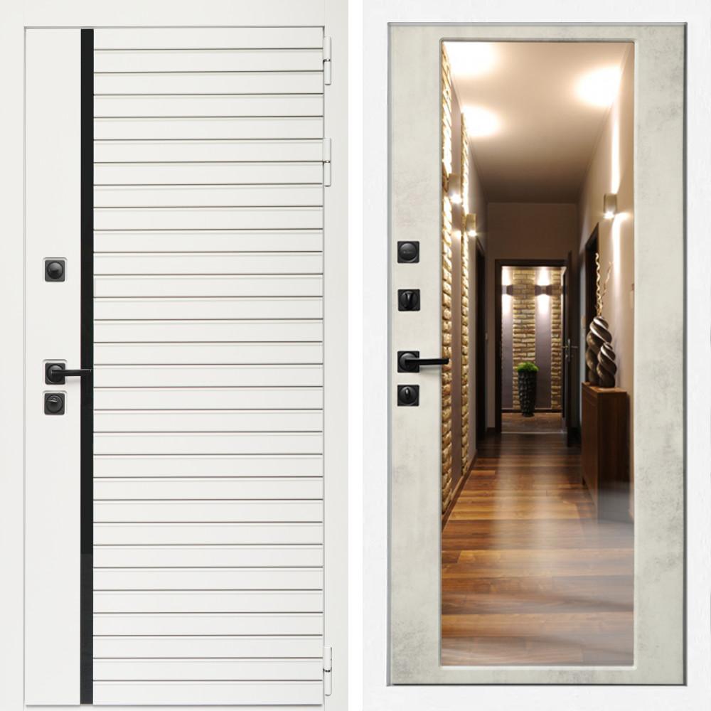 Входная дверь Inteko Агата Вайт (Бел мат, черное стекло) + Зеркало бетон светлый
