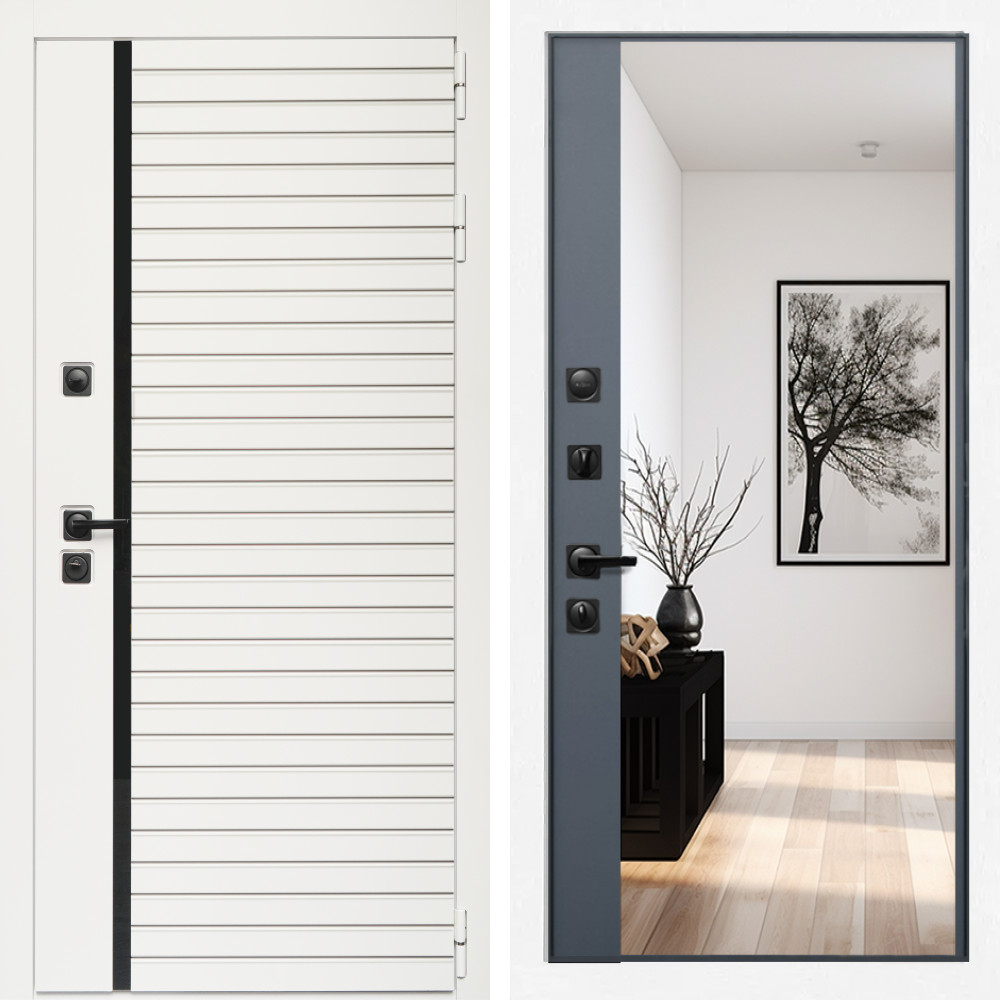 Входная дверь Inteko Агата Вайт (Бел мат, черное стекло) + Зеркало панорама Графит