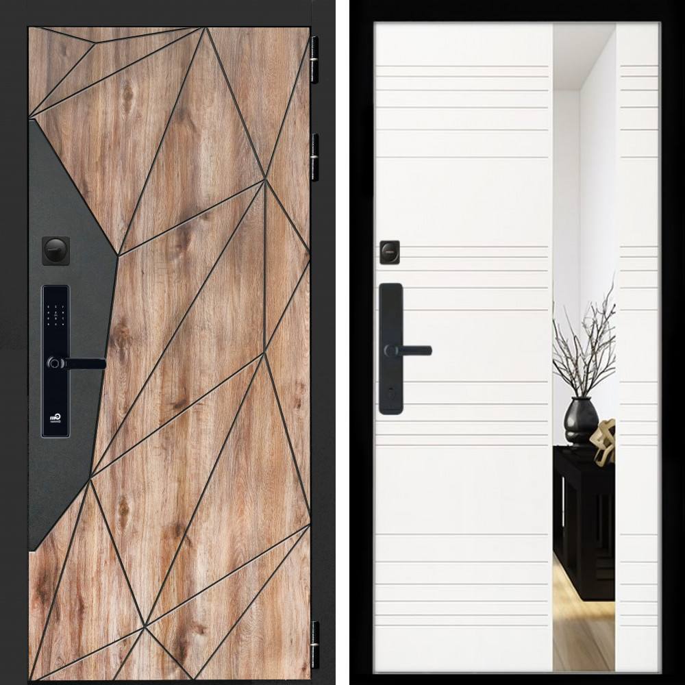 Входная дверь • Габаритные размеры: 2050x860 мм, 2050x960 мм • Металл 1.8мм. Черная шагрень • Внешнее покрытие: МДФ 12 мм. • Толщина полотна: 115 мм. • Толщина коробки: 120 мм. • Короб закрытого типа, утепленный • Уплотнитель: 3 контура • Два вертикальных ребра жесткости • ЭЛЕКТРОННЫЙ ЗАМОК НА ВЫБОР • Замок дополнительный: Гардиан 6001 • Врезная броненакладка • Пазы на коробке под доборы • Независимая задвижка есть • Фурнитура ЧЕРНАЯ