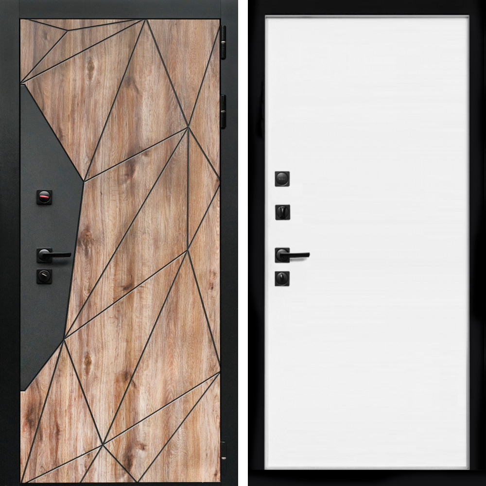 Входная дверь • Габаритные размеры: 2050x860 мм, 2050x960 мм • Металл 1.5мм. • Внешнее покрытие: МДФ 12 мм. • Цвет покрытия: Графит. • Толщина полотна: 100 мм. • Толщина коробки: 105 мм. • Окрас короба:Черная шагрень. • Короб закрытого типа, утепленный. • Уплотнитель: 3 контура. • Два вертикальных ребра жесткости. • Замок основной: Guardian 3211 (цилиндровый). • Замок дополнительный: Guardian 300 • Врезная броненакладка. • Независимая задвижка есть. • Фурнитура Черная.