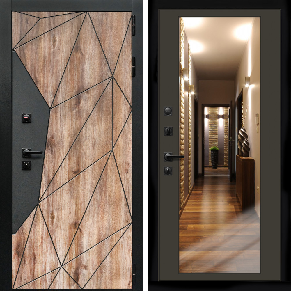 Входная дверь • Габаритные размеры: 2050x860 мм, 2050x960 мм • Металл 1.8мм • Внешнее покрытие: МДФ 16 мм. • Толщина полотна: 115 мм. • Толщина коробки: 120 мм. • Короб закрытого типа, утепленный • Уплотнитель: 3 контура • Два вертикальных ребра жесткости • Замок основной: Гардиан 6211 с блокировкой язычка • Замок дополнительный: Гардиан 6001 • Врезная броненакладка • Пазы на коробке под доборы • Независимая задвижка есть • Фурнитура Черная