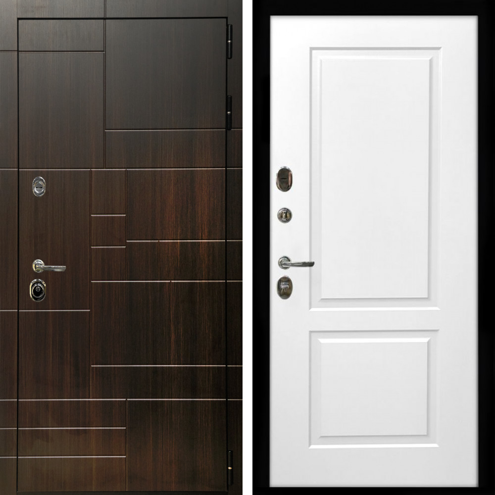 Входная дверь • Габаритные размеры: 2050x860 мм, 2050x960 мм • Металл 1.8мм • Внешнее покрытие: МДФ 16 мм. • Толщина полотна: 115 мм. • Толщина коробки: 120 мм. • Короб закрытого типа, утепленный • Уплотнитель: 3 контура • Два вертикальных ребра жесткости • Замок основной: Гардиан 6211 с блокировкой язычка • Замок дополнительный: Гардиан 6001 • Врезная броненакладка • Пазы на коробке под доборы • Независимая задвижка есть • Фурнитура ХРОМ