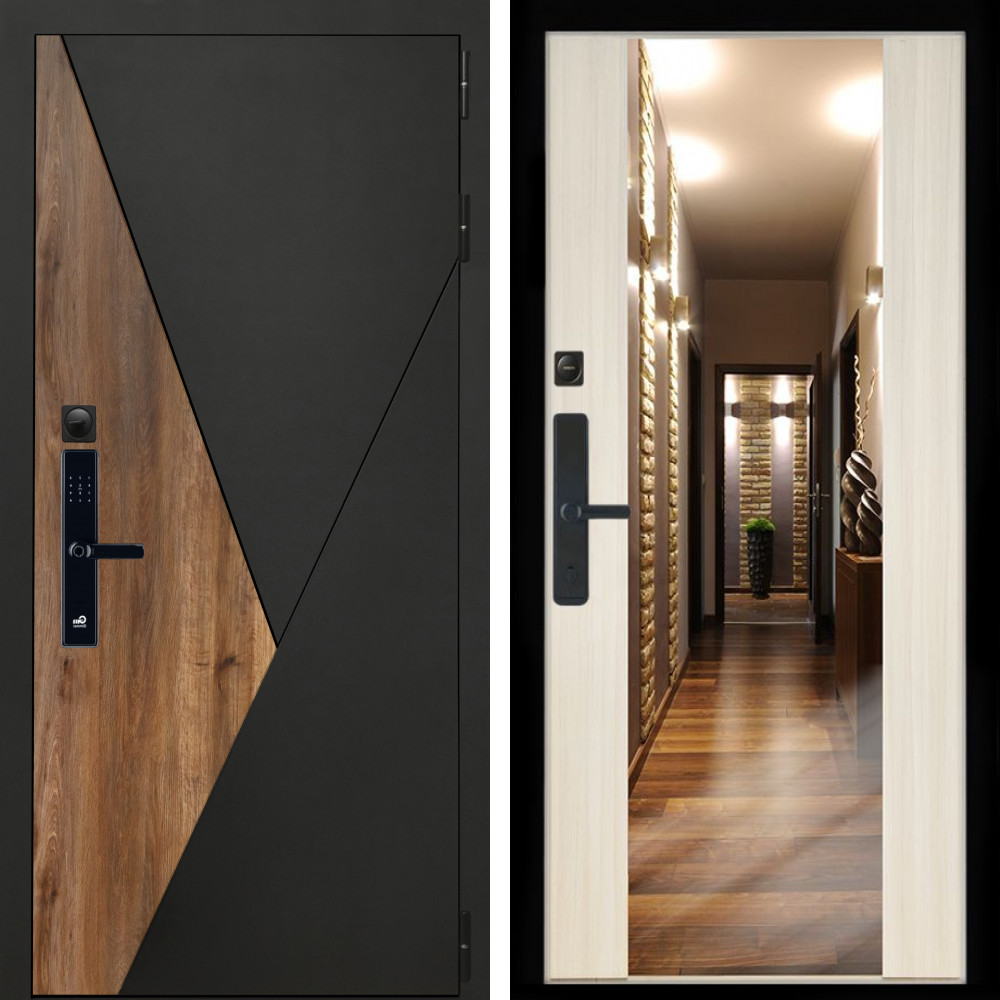 Входная дверь • Габаритные размеры: 2050x860 мм, 2050x960 мм • Металл 1.8мм. Черная шагрень • Внешнее покрытие: МДФ 12 мм. • Толщина полотна: 115 мм. • Толщина коробки: 120 мм. • Короб закрытого типа, утепленный • Уплотнитель: 3 контура • Два вертикальных ребра жесткости • ЭЛЕКТРОННЫЙ ЗАМОК НА ВЫБОР • Замок дополнительный: Гардиан 6001 • Врезная броненакладка • Пазы на коробке под доборы • Независимая задвижка есть • Фурнитура ЧЕРНАЯ