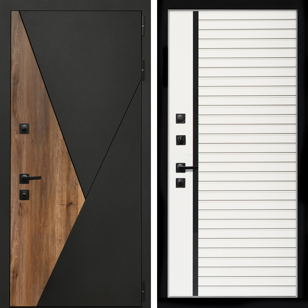 Входная дверь • Габаритные размеры: 2050x860 мм, 2050x960 мм • Металл 1.8мм • Внешнее покрытие: МДФ 16 мм белый мат с молдингом черная лакобель • Толщина полотна: 115 мм. • Толщина коробки: 120 мм. • Короб закрытого типа, утепленный • Уплотнитель: 3 контура • Два вертикальных ребра жесткости • Замок основной: Гардиан 6211 с блокировкой язычка • Замок дополнительный: Гардиан 6001 • Врезная броненакладка • Пазы на коробке под доборы • Независимая задвижка есть • Фурнитура Черная ..