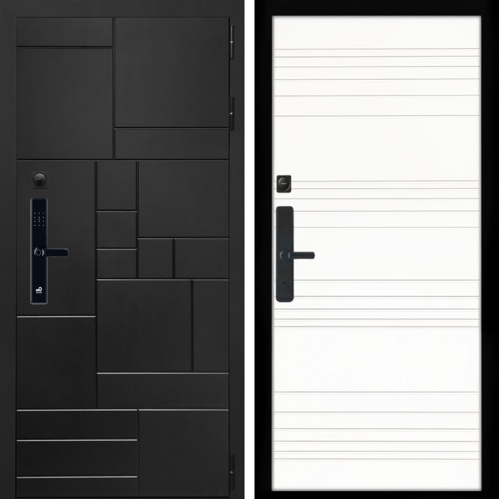 Входная дверь • Габаритные размеры: 2050x860 мм, 2050x960 мм • Металл 1.8мм • Внешнее покрытие: МДФ 16 мм белый мат с молдингом черная лакобель • Толщина полотна: 115 мм. • Толщина коробки: 120 мм. • Короб закрытого типа, утепленный • Уплотнитель: 3 контура • Два вертикальных ребра жесткости • Замок основной: Гардиан 6211 с блокировкой язычка • Замок дополнительный: Гардиан 6001 • Врезная броненакладка • Пазы на коробке под доборы • Независимая задвижка есть • Фурнитура Черная ..