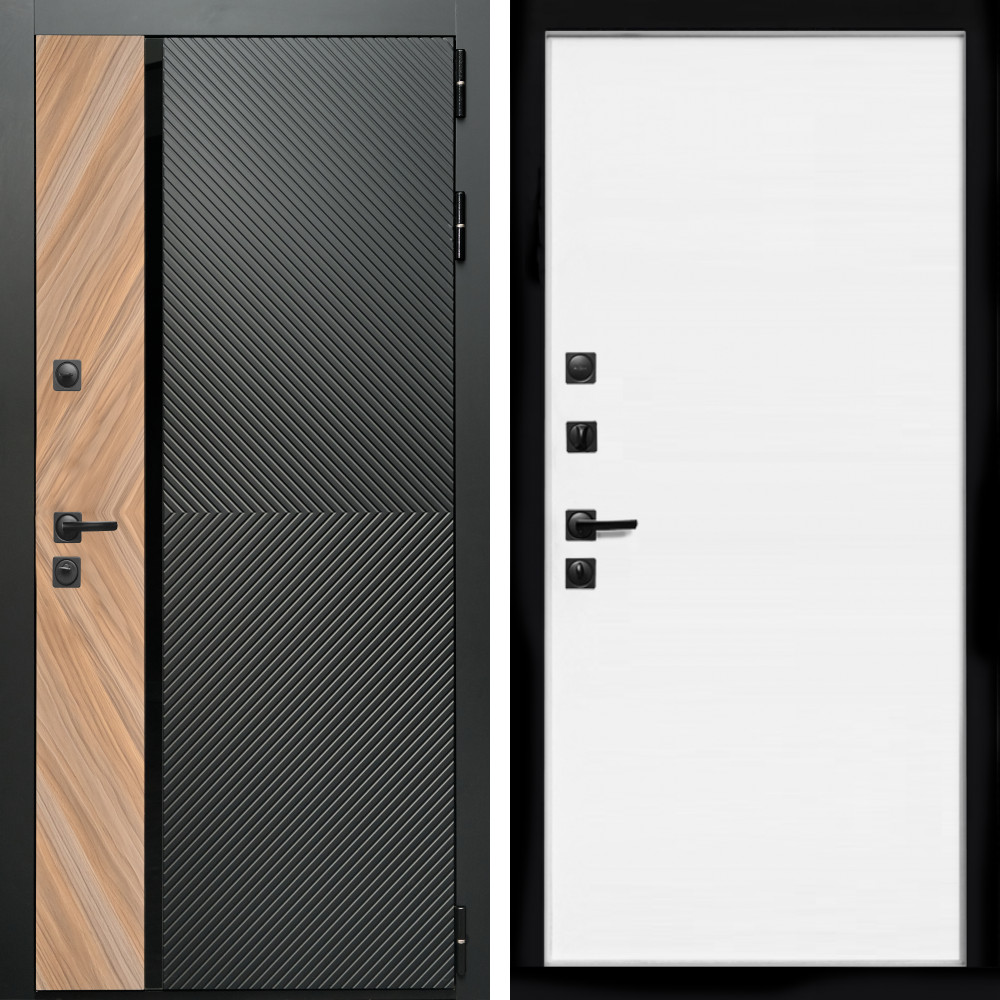 Входная дверь • Габаритные размеры: 2050x860 мм, 2050x960 мм • Металл 1.8мм • Внешнее покрытие: МДФ 16 мм. • Толщина полотна: 115 мм. • Толщина коробки: 120 мм. • Короб закрытого типа, утепленный • Уплотнитель: 3 контура • Два вертикальных ребра жесткости • Замок основной: Гардиан 6211 с блокировкой язычка • Замок дополнительный: Гардиан 6001 • Врезная броненакладка • Пазы на коробке под доборы • Независимая задвижка есть • Фурнитура Черная ..
