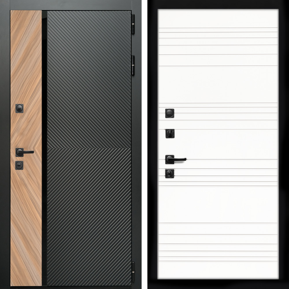 Входная дверь • Габаритные размеры: 2050x860 мм, 2050x960 мм • Металл 1.8мм • Внешнее покрытие: МДФ 16 мм. • Толщина полотна: 115 мм. • Толщина коробки: 120 мм. • Короб закрытого типа, утепленный • Уплотнитель: 3 контура • Два вертикальных ребра жесткости • Замок основной: Гардиан 6211 с блокировкой язычка • Замок дополнительный: Гардиан 6001 • Врезная броненакладка • Пазы на коробке под доборы • Независимая задвижка есть • Фурнитура Черная ..
