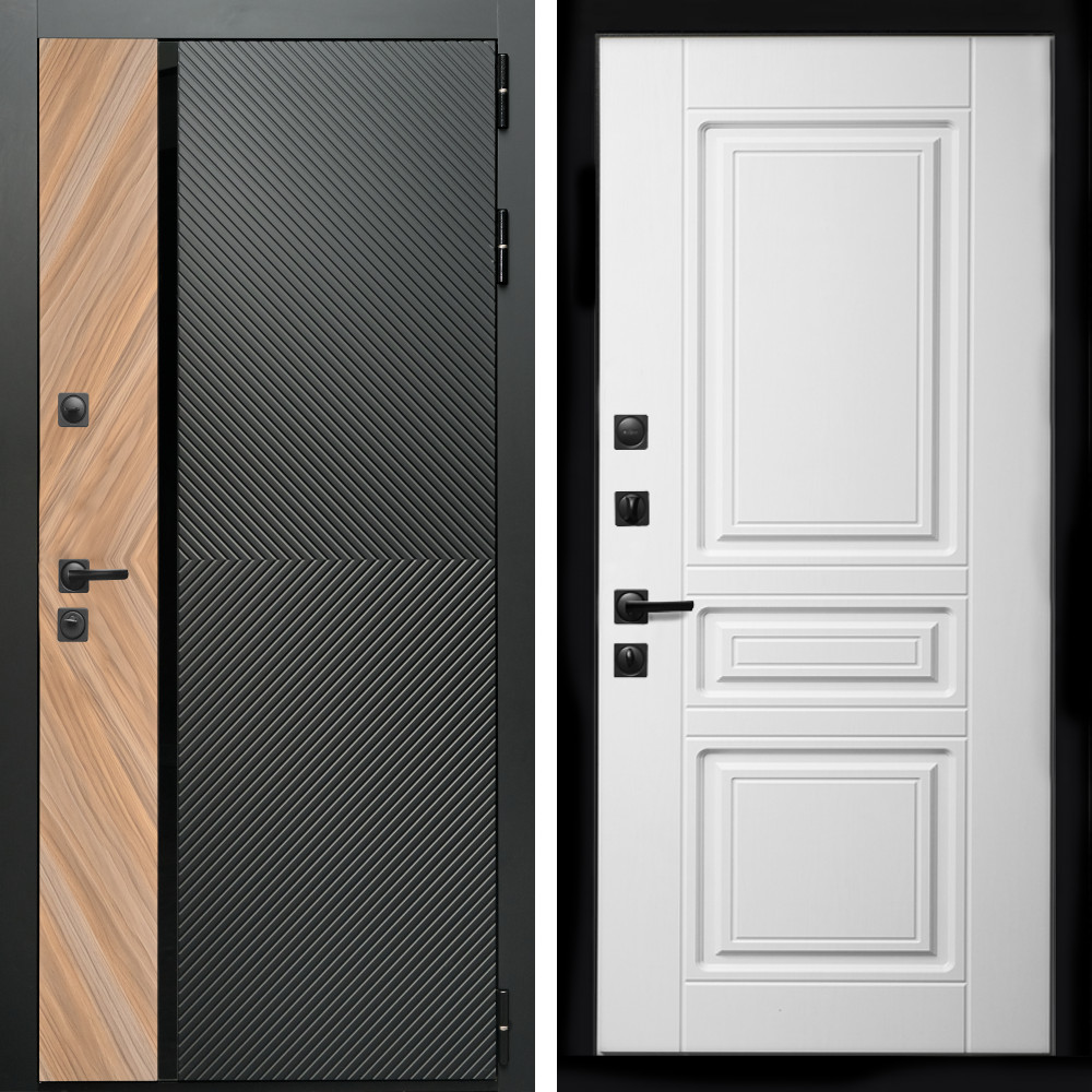 Входная дверь • Габаритные размеры: 2050x860 мм, 2050x960 мм • Металл 1.8мм • Внешнее покрытие: МДФ 16 мм белый мат с молдингом черная лакобель • Толщина полотна: 115 мм. • Толщина коробки: 120 мм. • Короб закрытого типа, утепленный • Уплотнитель: 3 контура • Два вертикальных ребра жесткости • Замок основной: Гардиан 6211 с блокировкой язычка • Замок дополнительный: Гардиан 6001 • Врезная броненакладка • Пазы на коробке под доборы • Независимая задвижка есть • Фурнитура Черная
