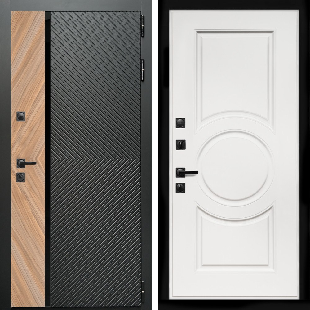 Входная дверь • Габаритные размеры: 2050x860 мм, 2050x960 мм • Металл 1.8мм • Внешнее покрытие: МДФ 16 мм. • Толщина полотна: 115 мм. • Толщина коробки: 120 мм. • Короб закрытого типа, утепленный • Уплотнитель: 3 контура • Два вертикальных ребра жесткости • Замок основной: Гардиан 6211 с блокировкой язычка • Замок дополнительный: Гардиан 6001 • Врезная броненакладка • Пазы на коробке под доборы • Независимая задвижка есть • Фурнитура Черная ..