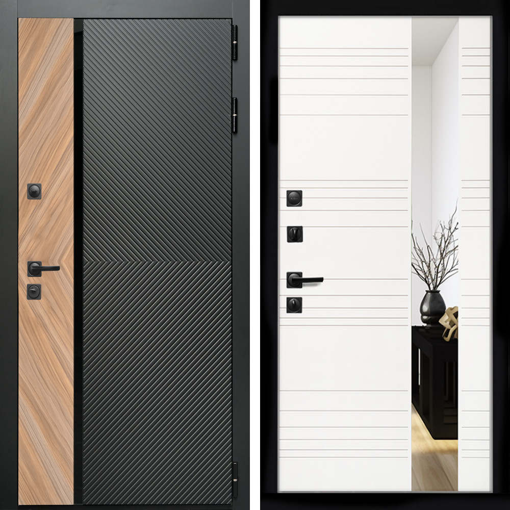 Входная дверь • Габаритные размеры: 2050x860 мм, 2050x960 мм • Металл 1.5мм. • Внешнее покрытие: МДФ 12 мм. • Цвет покрытия: Дуб американский/Черный кварц. • Толщина полотна: 100 мм. • Толщина коробки: 105 мм. • Окрас короба:Черная шагрень. • Короб закрытого типа, утепленный. • Уплотнитель: 3 контура. • Два вертикальных ребра жесткости. • Замок основной: Guardian 3211 (цилиндровый). • Замок дополнительный: Guardian 3001 (сувальдный). • Врезная броненакладка. • Независимая задвижка есть. • Фурнитура Черная. ..