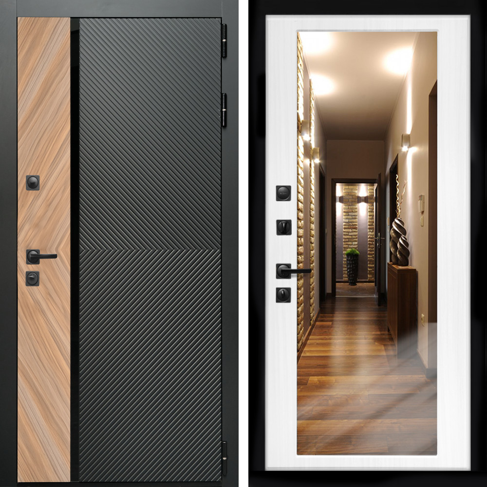 Входная дверь • Габаритные размеры: 2050x860 мм, 2050x960 мм • Металл 1.5мм. • Внешнее покрытие: МДФ 12 мм. • Цвет покрытия: Дуб американский/Черный кварц. • Толщина полотна: 100 мм. • Толщина коробки: 105 мм. • Окрас короба:Черная шагрень. • Короб закрытого типа, утепленный. • Уплотнитель: 3 контура. • Два вертикальных ребра жесткости. • Замок основной: Guardian 3211 (цилиндровый). • Замок дополнительный: Guardian 3001 (сувальдный). • Врезная броненакладка. • Независимая задвижка есть. • Фурнитура Черная. ..