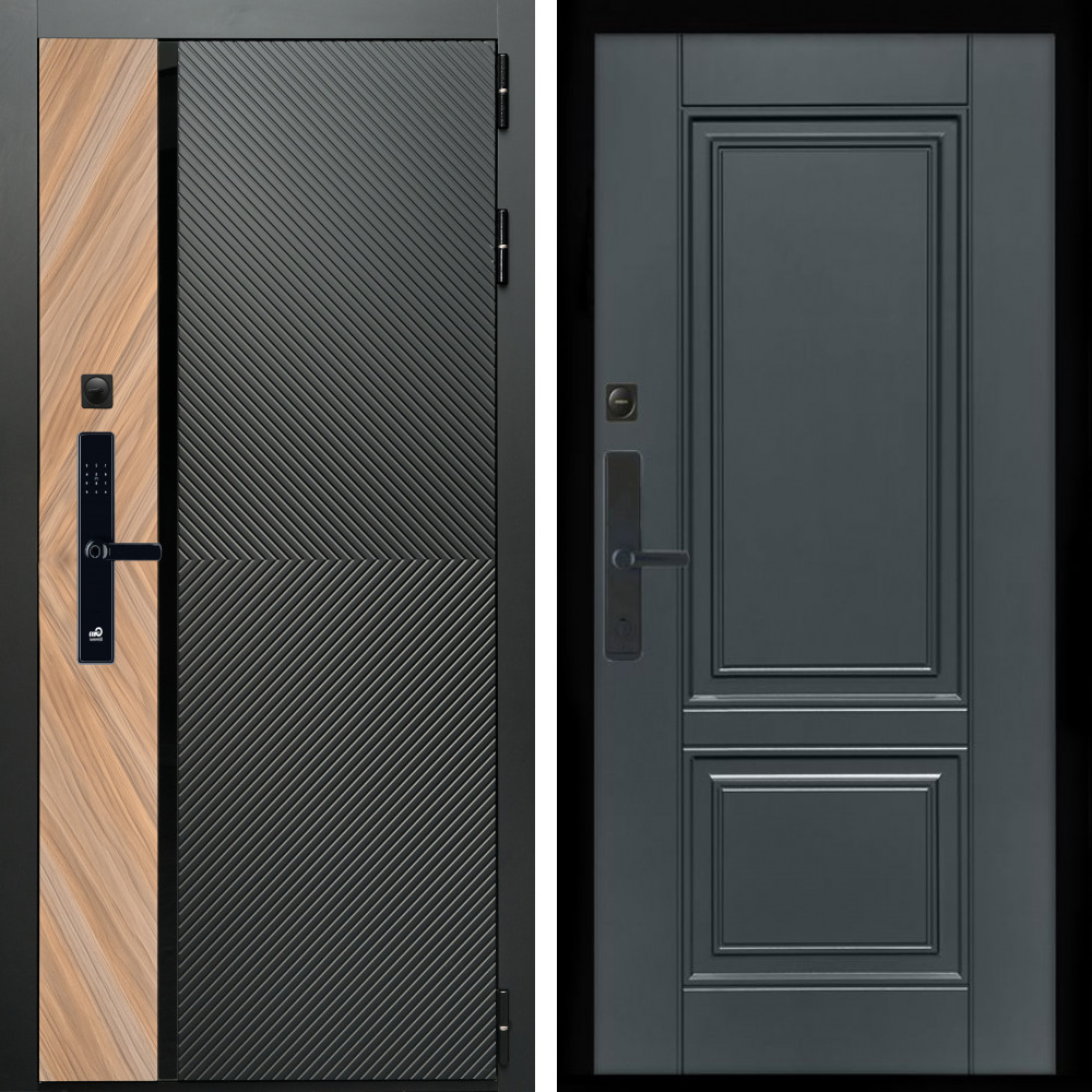 Входная дверь • Габаритные размеры: 2050x860 мм, 2050x960 мм • Металл 1.8мм. Черная шагрень • Внешнее покрытие: МДФ 12 мм. • Толщина полотна: 115 мм. • Толщина коробки: 120 мм. • Короб закрытого типа, утепленный • Уплотнитель: 3 контура • Два вертикальных ребра жесткости • ЭЛЕКТРОННЫЙ ЗАМОК НА ВЫБОР • Замок дополнительный: Гардиан 6001 • Врезная броненакладка • Пазы на коробке под доборы • Независимая задвижка есть • Фурнитура ЧЕРНАЯ