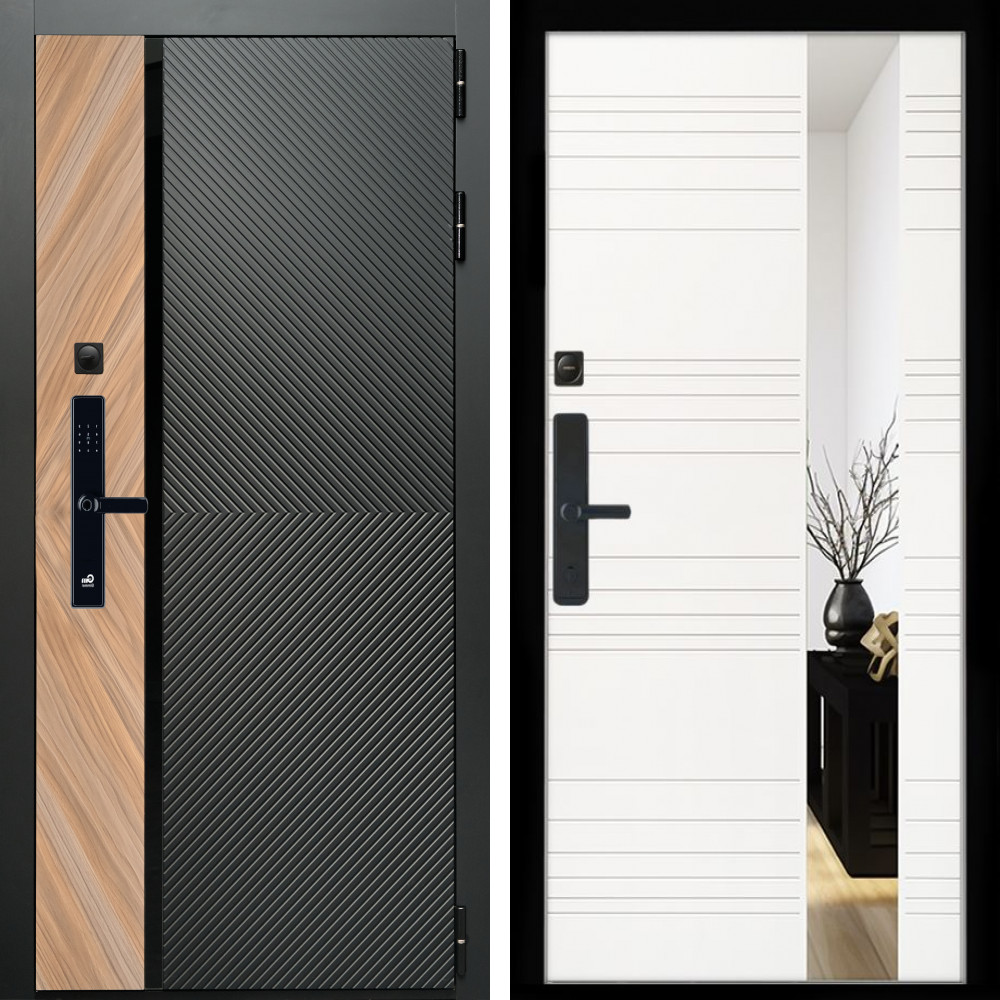 Входная дверь • Габаритные размеры: 2050x860 мм, 2050x960 мм • Металл 1.8мм. Черная шагрень • Внешнее покрытие: МДФ 12 мм. • Толщина полотна: 115 мм. • Толщина коробки: 120 мм. • Короб закрытого типа, утепленный • Уплотнитель: 3 контура • Два вертикальных ребра жесткости • ЭЛЕКТРОННЫЙ ЗАМОК НА ВЫБОР • Замок дополнительный: Гардиан 6001 • Врезная броненакладка • Пазы на коробке под доборы • Независимая задвижка есть • Фурнитура ЧЕРНАЯ ..