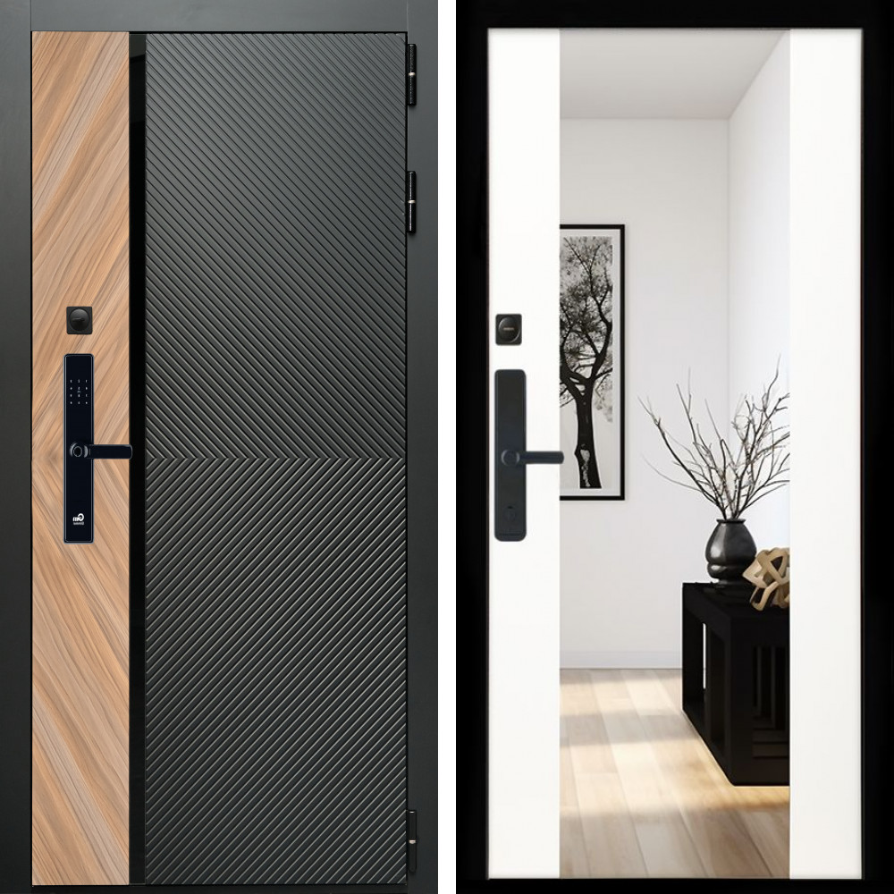 Входная дверь • Габаритные размеры: 2050x860 мм, 2050x960 мм • Металл 1.8мм. Черная шагрень • Внешнее покрытие: МДФ 12 мм. • Толщина полотна: 115 мм. • Толщина коробки: 120 мм. • Короб закрытого типа, утепленный • Уплотнитель: 3 контура • Два вертикальных ребра жесткости • ЭЛЕКТРОННЫЙ ЗАМОК НА ВЫБОР • Замок дополнительный: Гардиан 6001 • Врезная броненакладка • Пазы на коробке под доборы • Независимая задвижка есть • Фурнитура ЧЕРНАЯ ..