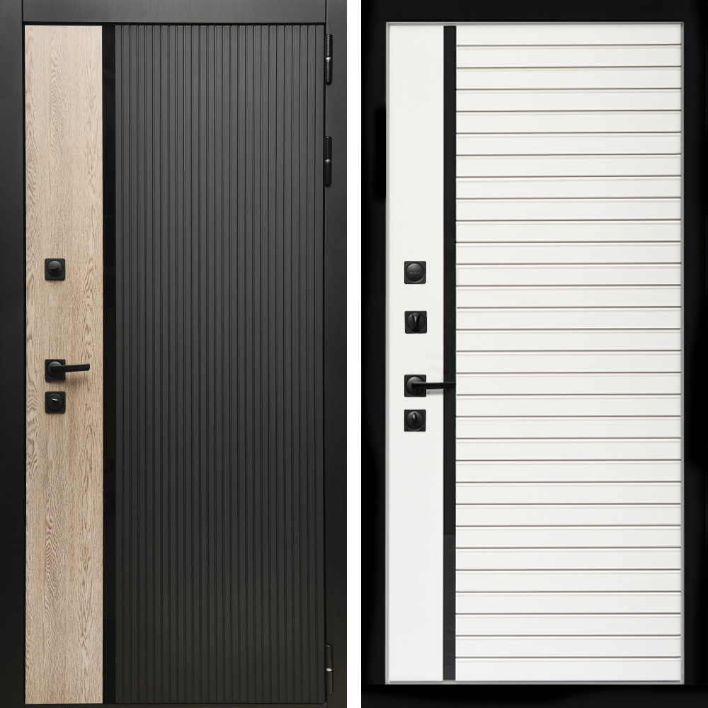 Входная дверь • Габаритные размеры: 2050x860 мм, 2050x960 мм • Металл 1.8мм • Внешнее покрытие: МДФ 16 мм. • Толщина полотна: 115 мм. • Толщина коробки: 120 мм. • Короб закрытого типа, утепленный • Уплотнитель: 3 контура • Два вертикальных ребра жесткости • Замок основной: Гардиан 6211 с блокировкой язычка • Замок дополнительный: Гардиан 6001 • Врезная броненакладка • Пазы на коробке под доборы • Независимая задвижка есть • Фурнитура Черная ..