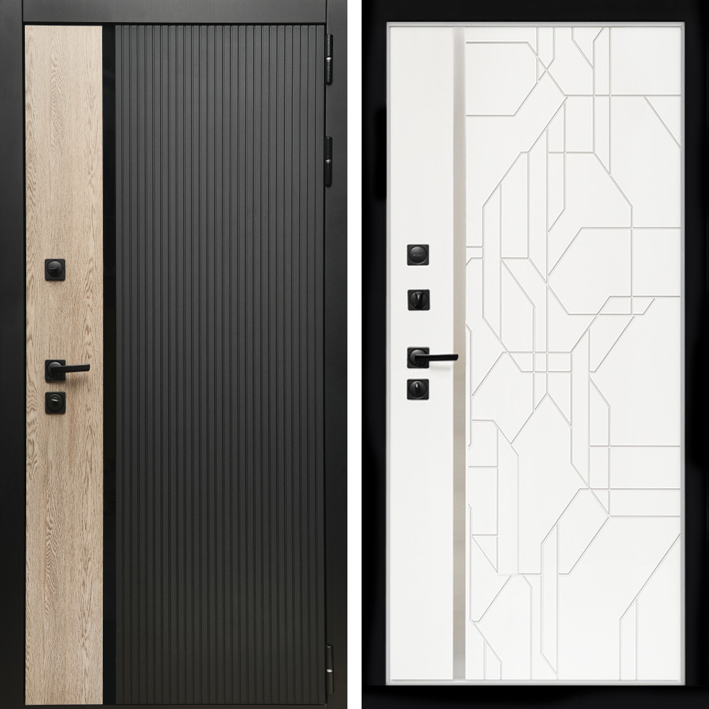 Входная дверь • Габаритные размеры: 2050x860 мм, 2050x960 мм • Металл 1.8мм • Внешнее покрытие: МДФ 16 мм. • Толщина полотна: 115 мм. • Толщина коробки: 120 мм. • Короб закрытого типа, утепленный • Уплотнитель: 3 контура • Два вертикальных ребра жесткости • Замок основной: Гардиан 6211 с блокировкой язычка • Замок дополнительный: Гардиан 6001 • Врезная броненакладка • Пазы на коробке под доборы • Независимая задвижка есть • Фурнитура Черная ..