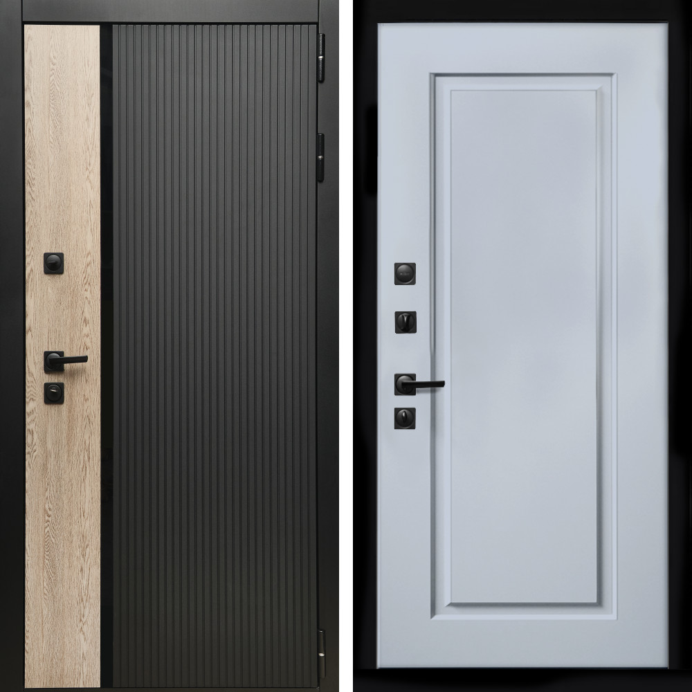 Входная дверь • Габаритные размеры: 2050x860 мм, 2050x960 мм • Металл 1.8мм • Внешнее покрытие: МДФ 16 мм. • Толщина полотна: 115 мм. • Толщина коробки: 120 мм. • Короб закрытого типа, утепленный • Уплотнитель: 3 контура • Два вертикальных ребра жесткости • Замок основной: Гардиан 6211 с блокировкой язычка • Замок дополнительный: Гардиан 6001 • Врезная броненакладка • Пазы на коробке под доборы • Независимая задвижка есть • Фурнитура Черная ..