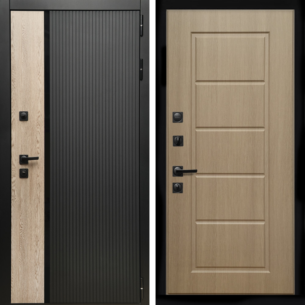 Входная дверь Inteko Престиж с стеклянной черной вставкой + ФЛ-39 эко дуб