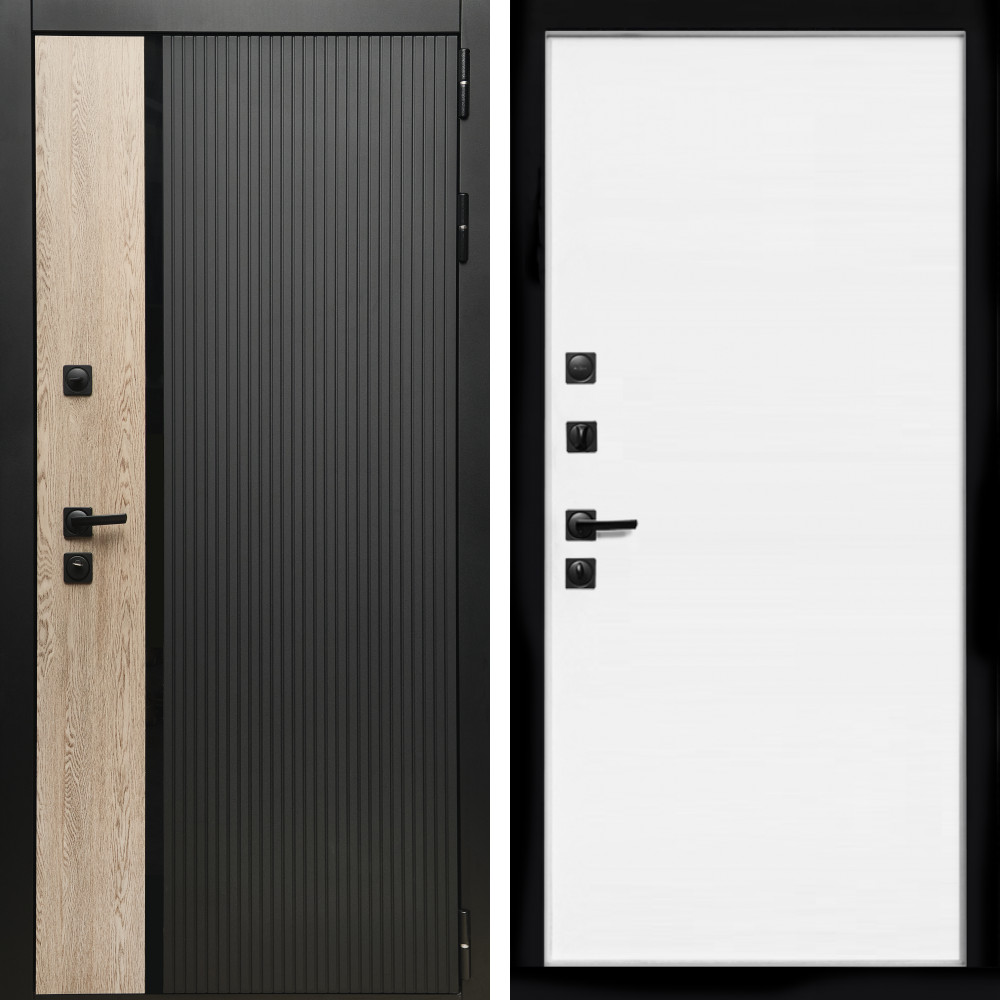 Входная дверь • Габаритные размеры: 2050x860 мм, 2050x960 мм • Металл 1.5мм. • Внешнее покрытие: МДФ 12 мм. • Цвет покрытия: Дуб американский/Черный кварц. • Толщина полотна: 100 мм. • Толщина коробки: 105 мм. • Окрас короба:Черная шагрень. • Короб закрытого типа, утепленный. • Уплотнитель: 3 контура. • Два вертикальных ребра жесткости. • Замок основной: Guardian 3211 (цилиндровый). • Замок дополнительный: Guardian 3001 (сувальдный). • Врезная броненакладка. • Независимая задвижка есть. • Фурнитура Черная. ..