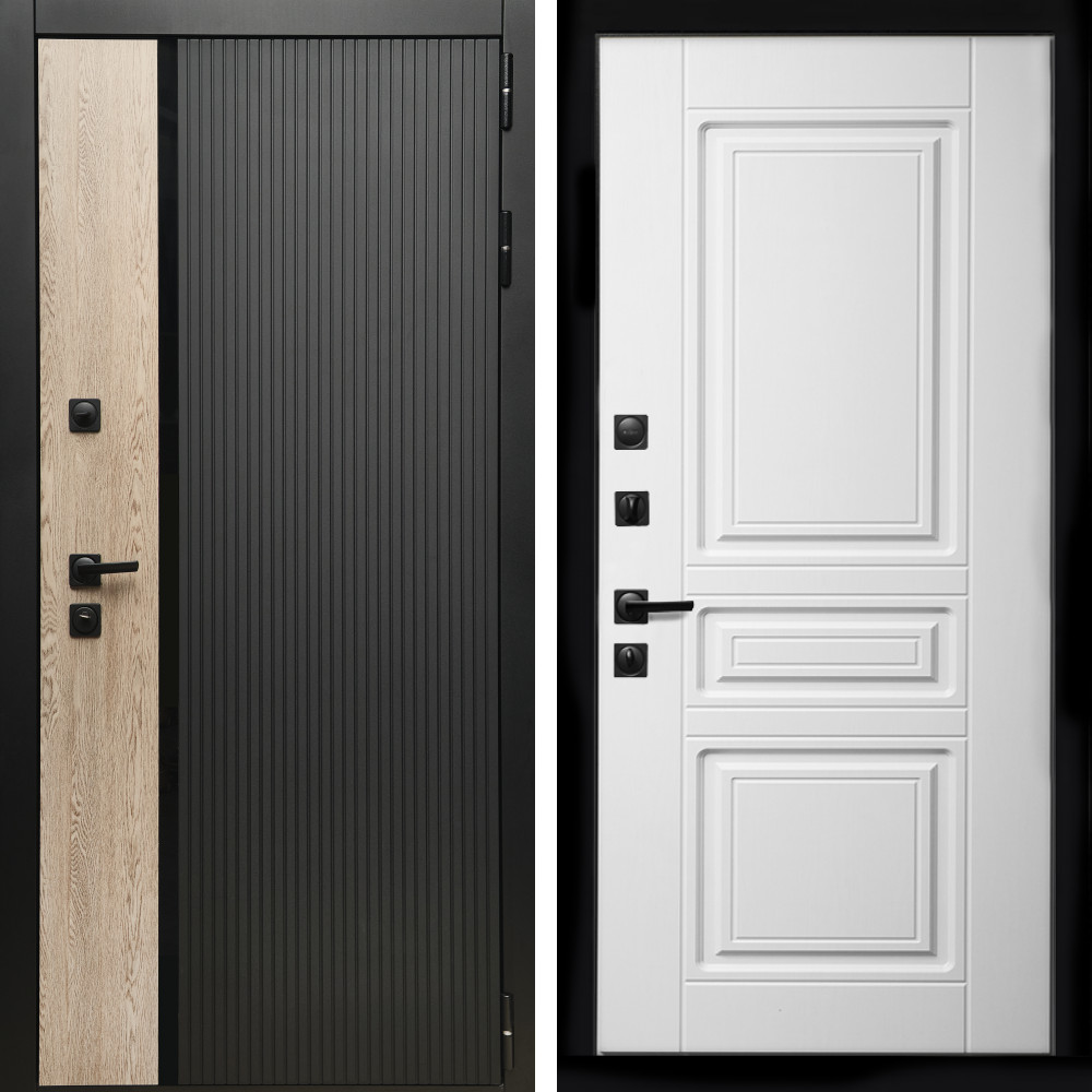Входная дверь • Габаритные размеры: 2050x860 мм, 2050x960 мм • Металл 1.8мм • Внешнее покрытие: МДФ 16 мм. • Толщина полотна: 115 мм. • Толщина коробки: 120 мм. • Короб закрытого типа, утепленный • Уплотнитель: 3 контура • Два вертикальных ребра жесткости • Замок основной: Гардиан 6211 с блокировкой язычка • Замок дополнительный: Гардиан 6001 • Врезная броненакладка • Пазы на коробке под доборы • Независимая задвижка есть • Фурнитура Черная ..