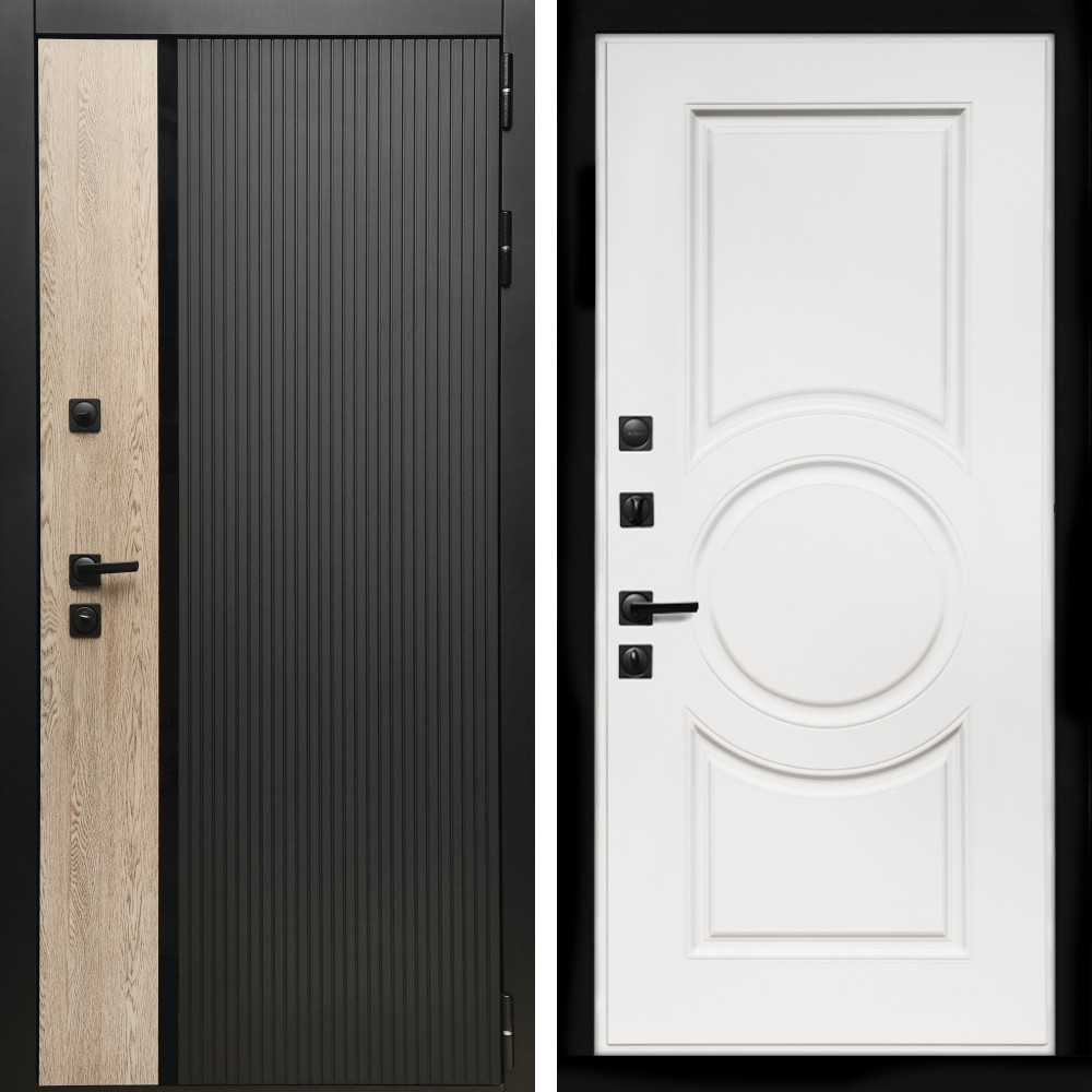 Входная дверь • Габаритные размеры: 2050x860 мм, 2050x960 мм • Металл 1.5мм. • Внешнее покрытие: МДФ 12 мм. • Цвет покрытия: Дуб американский/Черный кварц. • Толщина полотна: 100 мм. • Толщина коробки: 105 мм. • Окрас короба:Черная шагрень. • Короб закрытого типа, утепленный. • Уплотнитель: 3 контура. • Два вертикальных ребра жесткости. • Замок основной: Guardian 3211 (цилиндровый). • Замок дополнительный: Guardian 3001 (сувальдный). • Врезная броненакладка. • Независимая задвижка есть. • Фурнитура Черная. ..