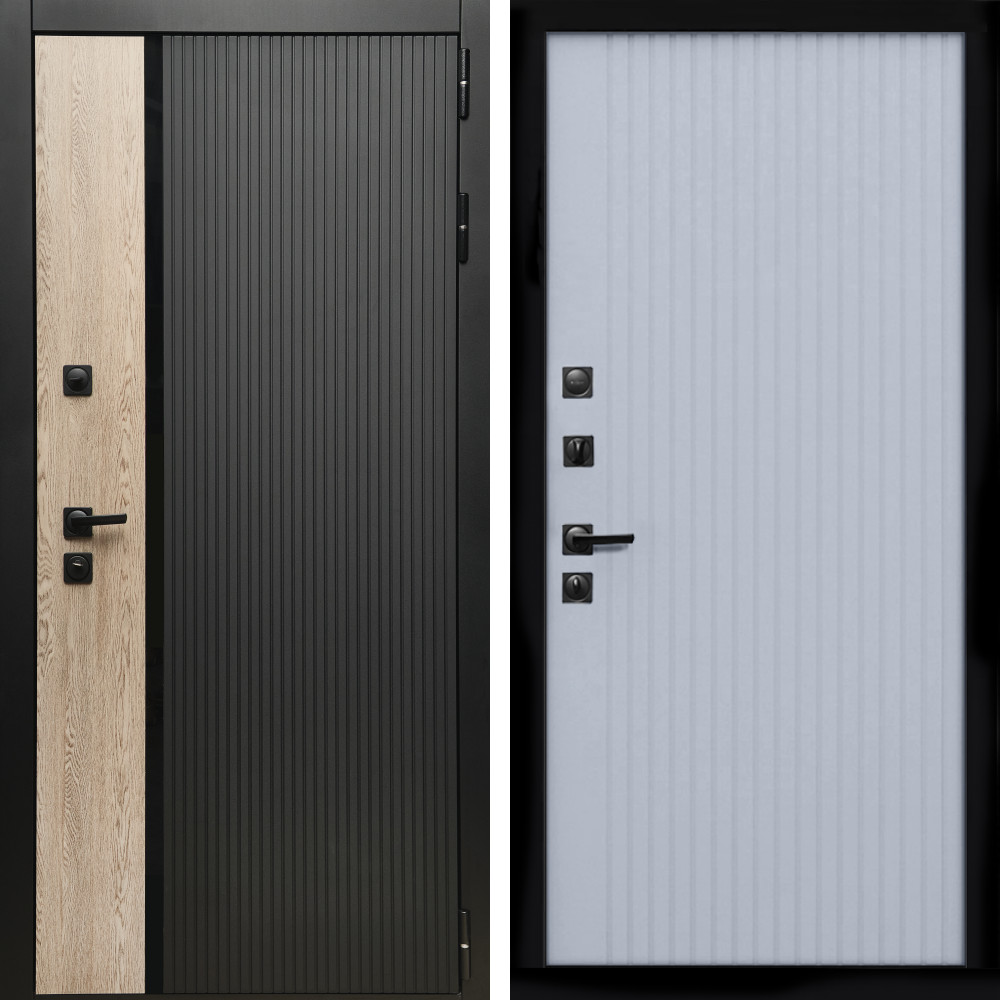Входная дверь • Габаритные размеры: 2050x860 мм, 2050x960 мм • Металл 1.8мм. Черная шагрень • Внешнее покрытие: МДФ 12 мм. • Толщина полотна: 115 мм. • Толщина коробки: 120 мм. • Короб закрытого типа, утепленный • Уплотнитель: 3 контура • Два вертикальных ребра жесткости • ЭЛЕКТРОННЫЙ ЗАМОК НА ВЫБОР • Замок дополнительный: Гардиан 6001 • Врезная броненакладка • Пазы на коробке под доборы • Независимая задвижка есть • Фурнитура ЧЕРНАЯ