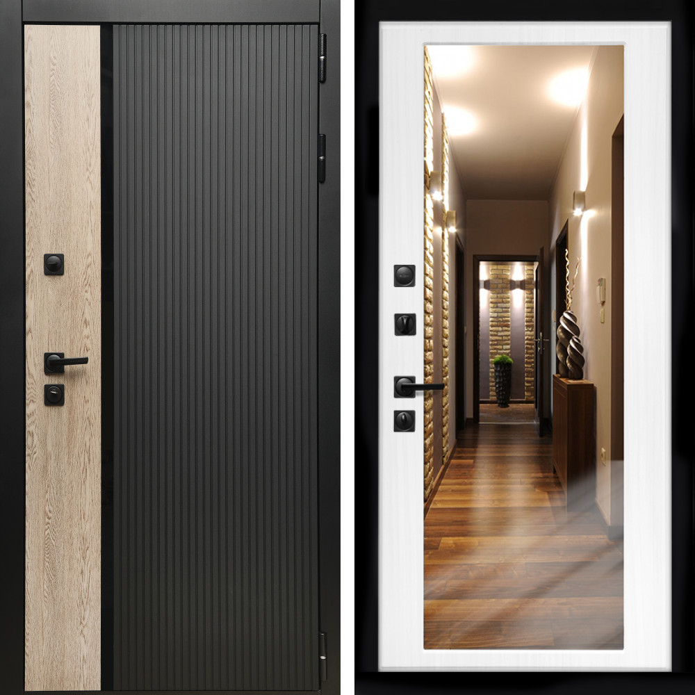Входная дверь Inteko Престиж с стеклянной черной вставкой + Зеркало беленый дуб