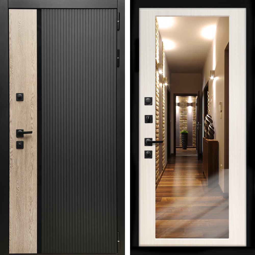 Входная дверь Inteko Престиж с стеклянной черной вставкой + Зеркало сандал белый