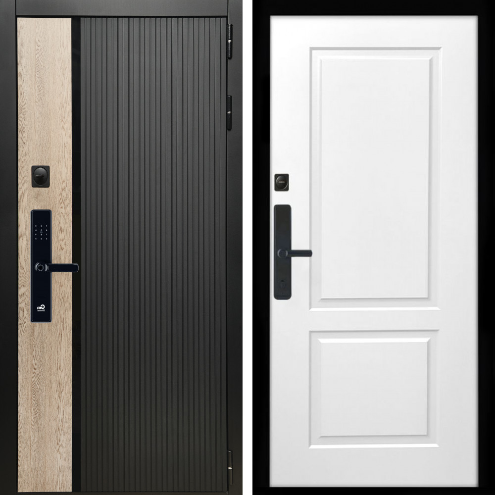 Входная дверь • Габаритные размеры: 2050x860 мм, 2050x960 мм • Металл 1.8мм. Черная шагрень • Внешнее покрытие: МДФ 12 мм. • Толщина полотна: 115 мм. • Толщина коробки: 120 мм. • Короб закрытого типа, утепленный • Уплотнитель: 3 контура • Два вертикальных ребра жесткости • ЭЛЕКТРОННЫЙ ЗАМОК НА ВЫБОР • Замок дополнительный: Гардиан 6001 • Врезная броненакладка • Пазы на коробке под доборы • Независимая задвижка есть • Фурнитура ЧЕРНАЯ ..
