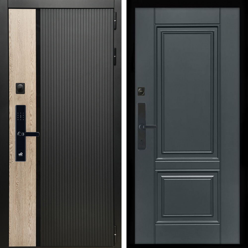 Входная дверь • Габаритные размеры: 2050x860 мм, 2050x960 мм • Металл 1.8мм. Черная шагрень • Внешнее покрытие: МДФ 12 мм. • Толщина полотна: 115 мм. • Толщина коробки: 120 мм. • Короб закрытого типа, утепленный • Уплотнитель: 3 контура • Два вертикальных ребра жесткости • ЭЛЕКТРОННЫЙ ЗАМОК НА ВЫБОР • Замок дополнительный: Гардиан 6001 • Врезная броненакладка • Пазы на коробке под доборы • Независимая задвижка есть • Фурнитура ЧЕРНАЯ ..