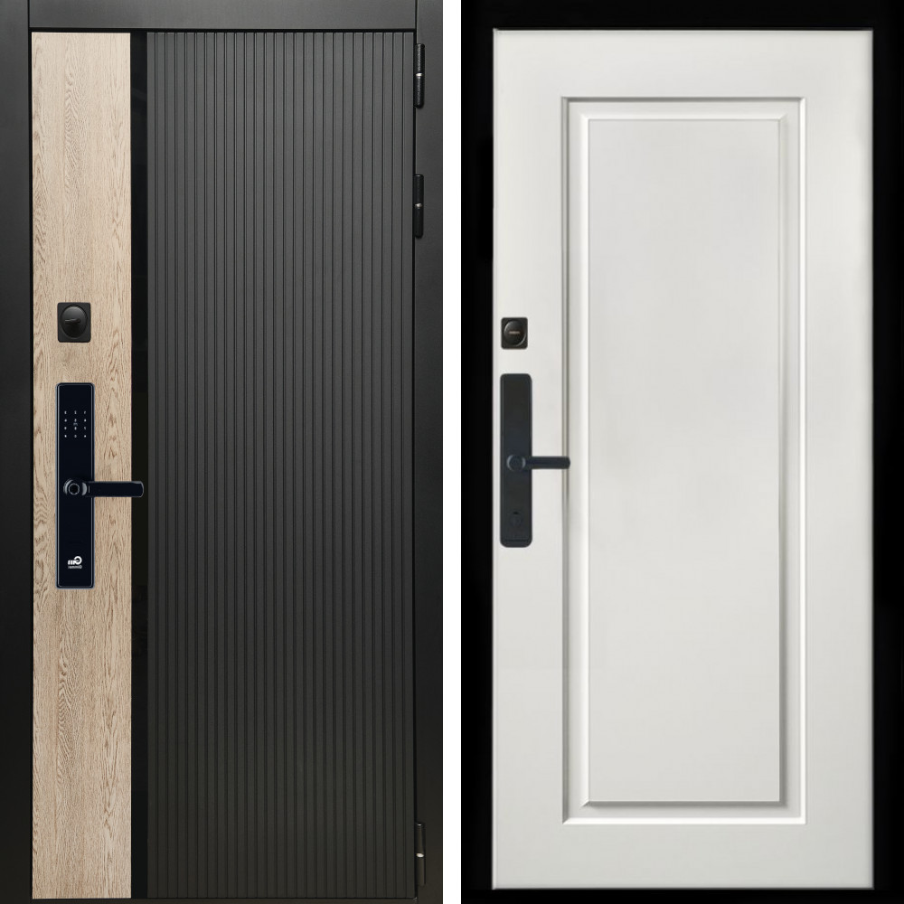 Входная дверь • Габаритные размеры: 2050x860 мм, 2050x960 мм • Металл 1.8мм. Черная шагрень • Внешнее покрытие: МДФ 12 мм. • Толщина полотна: 115 мм. • Толщина коробки: 120 мм. • Короб закрытого типа, утепленный • Уплотнитель: 3 контура • Два вертикальных ребра жесткости • ЭЛЕКТРОННЫЙ ЗАМОК НА ВЫБОР • Замок дополнительный: Гардиан 6001 • Врезная броненакладка • Пазы на коробке под доборы • Независимая задвижка есть • Фурнитура ЧЕРНАЯ ..