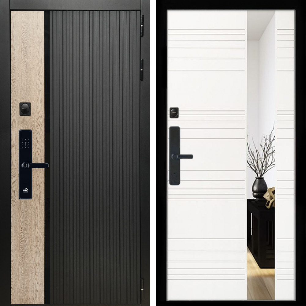 Входная дверь • Габаритные размеры: 2050x860 мм, 2050x960 мм • Металл 1.8мм. Черная шагрень • Внешнее покрытие: МДФ 12 мм. • Толщина полотна: 115 мм. • Толщина коробки: 120 мм. • Короб закрытого типа, утепленный • Уплотнитель: 3 контура • Два вертикальных ребра жесткости • ЭЛЕКТРОННЫЙ ЗАМОК НА ВЫБОР • Замок дополнительный: Гардиан 6001 • Врезная броненакладка • Пазы на коробке под доборы • Независимая задвижка есть • Фурнитура ЧЕРНАЯ ..