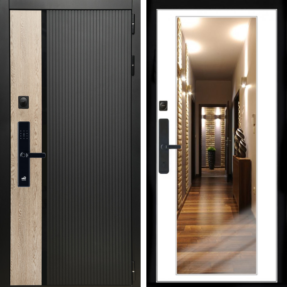 Входная дверь • Габаритные размеры: 2050x860 мм, 2050x960 мм • Металл 1.8мм. Черная шагрень • Внешнее покрытие: МДФ 12 мм. • Толщина полотна: 115 мм. • Толщина коробки: 120 мм. • Короб закрытого типа, утепленный • Уплотнитель: 3 контура • Два вертикальных ребра жесткости • ЭЛЕКТРОННЫЙ ЗАМОК НА ВЫБОР • Замок дополнительный: Гардиан 6001 • Врезная броненакладка • Пазы на коробке под доборы • Независимая задвижка есть • Фурнитура ЧЕРНАЯ ..