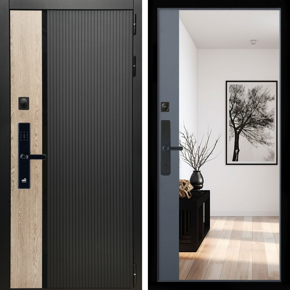 Входная дверь • Габаритные размеры: 2050x860 мм, 2050x960 мм • Металл 1.8мм. Черная шагрень • Внешнее покрытие: МДФ 12 мм. • Толщина полотна: 115 мм. • Толщина коробки: 120 мм. • Короб закрытого типа, утепленный • Уплотнитель: 3 контура • Два вертикальных ребра жесткости • ЭЛЕКТРОННЫЙ ЗАМОК НА ВЫБОР • Замок дополнительный: Гардиан 6001 • Врезная броненакладка • Пазы на коробке под доборы • Независимая задвижка есть • Фурнитура ЧЕРНАЯ ..