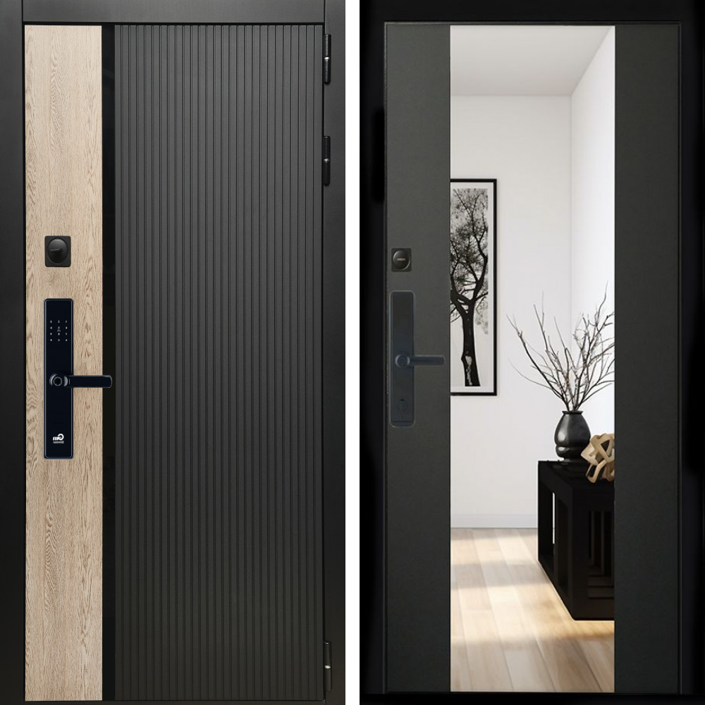 Входная дверь • Габаритные размеры: 2050x860 мм, 2050x960 мм • Металл 1.8мм. Черная шагрень • Внешнее покрытие: МДФ 12 мм. • Толщина полотна: 115 мм. • Толщина коробки: 120 мм. • Короб закрытого типа, утепленный • Уплотнитель: 3 контура • Два вертикальных ребра жесткости • ЭЛЕКТРОННЫЙ ЗАМОК НА ВЫБОР • Замок дополнительный: Гардиан 6001 • Врезная броненакладка • Пазы на коробке под доборы • Независимая задвижка есть • Фурнитура ЧЕРНАЯ
