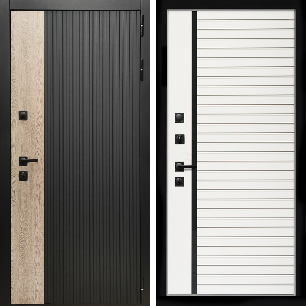 Входная дверь • Габаритные размеры: 2050x860 мм, 2050x960 мм • Металл 1.5мм. • Внешнее покрытие: МДФ 12 мм. • Цвет покрытия: Графит. • Толщина полотна: 100 мм. • Толщина коробки: 105 мм. • Окрас короба:Черная шагрень. • Короб закрытого типа, утепленный. • Уплотнитель: 3 контура. • Два вертикальных ребра жесткости. • Замок основной: Guardian 3211 (цилиндровый). • Замок дополнительный: Guardian 300 • Врезная броненакладка. • Независимая задвижка есть. • Фурнитура Черная. ..