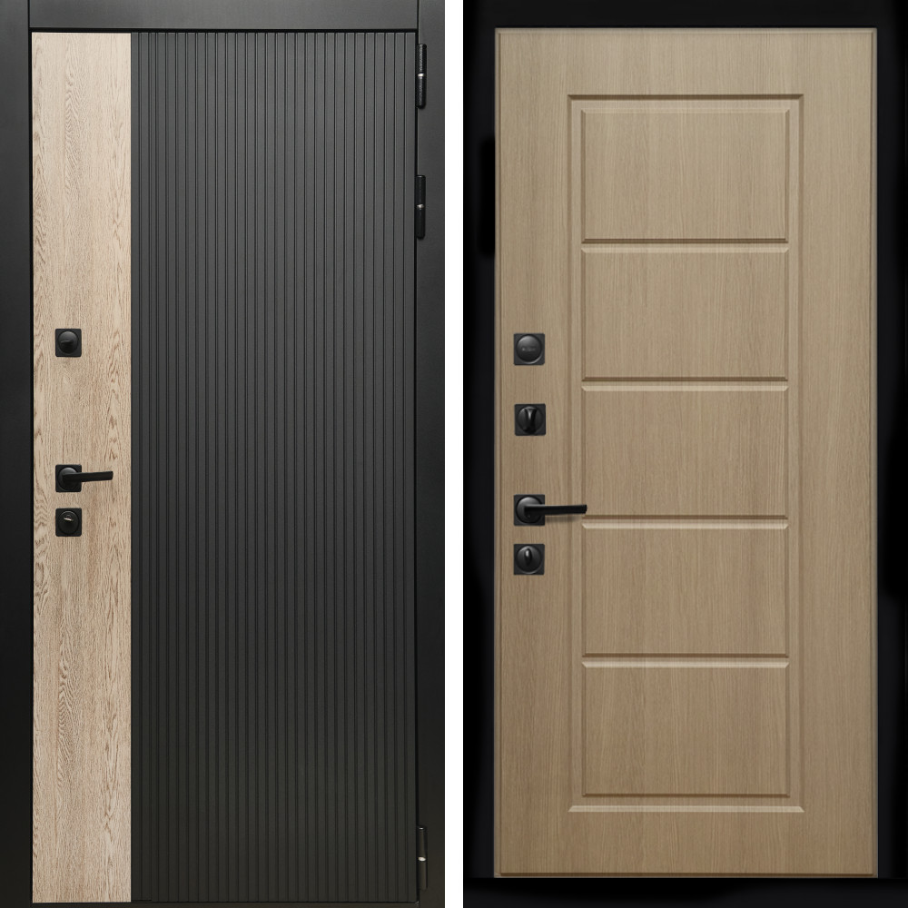 Входная дверь • Габаритные размеры: 2050x860 мм, 2050x960 мм • Металл 1.8мм • Внешнее покрытие: МДФ 16 мм. • Толщина полотна: 115 мм. • Толщина коробки: 120 мм. • Короб закрытого типа, утепленный • Уплотнитель: 3 контура • Два вертикальных ребра жесткости • Замок основной: Гардиан 6211 с блокировкой язычка • Замок дополнительный: Гардиан 6001 • Врезная броненакладка • Пазы на коробке под доборы • Независимая задвижка есть • Фурнитура Черная ..