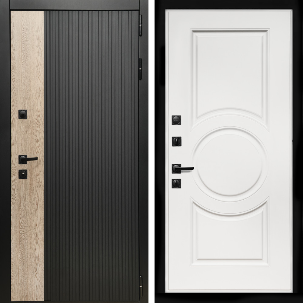 Входная дверь • Габаритные размеры: 2050x860 мм, 2050x960 мм • Металл 1.5мм. • Внешнее покрытие: МДФ 12 мм. • Цвет покрытия: Черный кварц. • Толщина полотна: 100 мм. • Толщина коробки: 105 мм. • Окрас короба:Черная шагрень. • Короб закрытого типа, утепленный. • Уплотнитель: 3 контура. • Два вертикальных ребра жесткости. • Замок основной: Guardian 3211 (цилиндровый). • Замок дополнительный: Guardian 300 • Врезная броненакладка. • Независимая задвижка есть. • Фурнитура Черная.