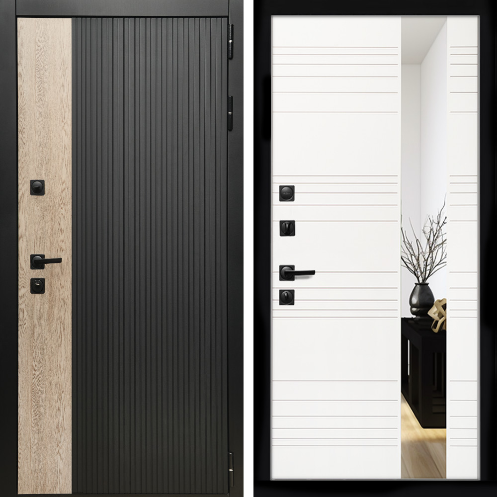 Входная дверь • Габаритные размеры: 2050x860 мм, 2050x960 мм • Металл 1.5мм. • Внешнее покрытие: МДФ 12 мм. • Цвет покрытия: Графит. • Толщина полотна: 100 мм. • Толщина коробки: 105 мм. • Окрас короба:Черная шагрень. • Короб закрытого типа, утепленный. • Уплотнитель: 3 контура. • Два вертикальных ребра жесткости. • Замок основной: Guardian 3211 (цилиндровый). • Замок дополнительный: Guardian 300 • Врезная броненакладка. • Независимая задвижка есть. • Фурнитура Черная. ..