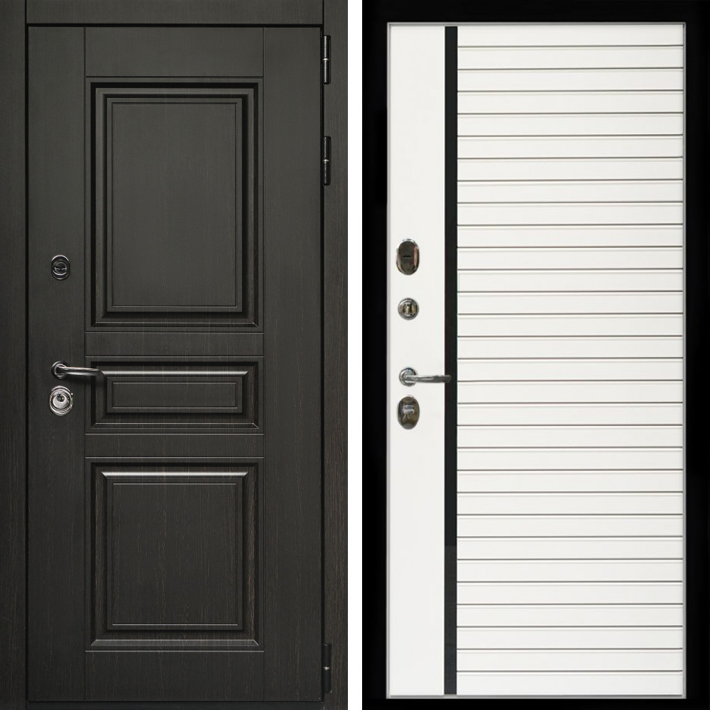 Входная дверь • Габаритные размеры: 2050x860 мм, 2050x960 мм • Металл 1.8мм • Внешнее покрытие: МДФ 16 мм. • Толщина полотна: 115 мм. • Толщина коробки: 120 мм. • Короб закрытого типа, утепленный • Уплотнитель: 3 контура • Два вертикальных ребра жесткости • Замок основной: Гардиан 6211 с блокировкой язычка • Замок дополнительный: Гардиан 6001 • Врезная броненакладка • Пазы на коробке под доборы • Независимая задвижка есть • Фурнитура Черная ..